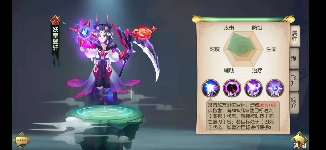 妖皇翼轩的技能在造成对位英雄巨额伤害的同时,还可以使其进入既死状态,在既死状态下,目标没回合都会减少1%最大血量,这个状态不会驱散,一直持续到战斗结束。两个被动技能,一个可以激活死亡镰刀,使得普通攻击可以连续攻击三次,另一个可以使得妖皇翼轩每攻击三次就可以提升自身攻击力,战斗时间越长,优势就越大。