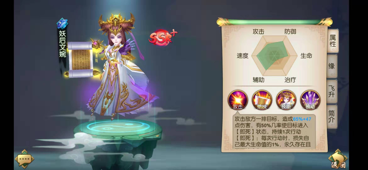 妖后文婉的技能同样可以使得攻击目标进入到既死状态,在攻击既死状态的目标时可以降低其行动速度,无论是妖后文婉的既死效果,还是妖皇翼轩的既死效果都是可以通用的,所以这两个英雄组合堪称最佳拍档。妖后文婉的技能还可以为三个己方目标施加护盾,自身攻击越到,护盾也就越强,是这套阵容中唯一的辅助技能。