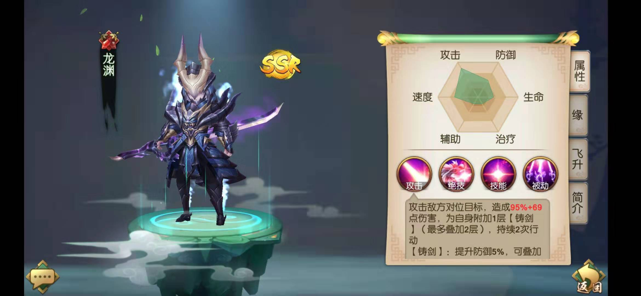 龙渊现在是公认的高攻击英雄,普通攻击、技能攻击都可以为自身叠加铸剑效果,每层铸剑效果提高自身5%的防御力。绝技可以在攻击单体的时候造成溅射效果,而且在绝招发动的时候,每层铸剑状态可以提高20%的伤害,最多消耗4层。这个爆发效果超过目前所有的英雄,而且非常稳定可控。
