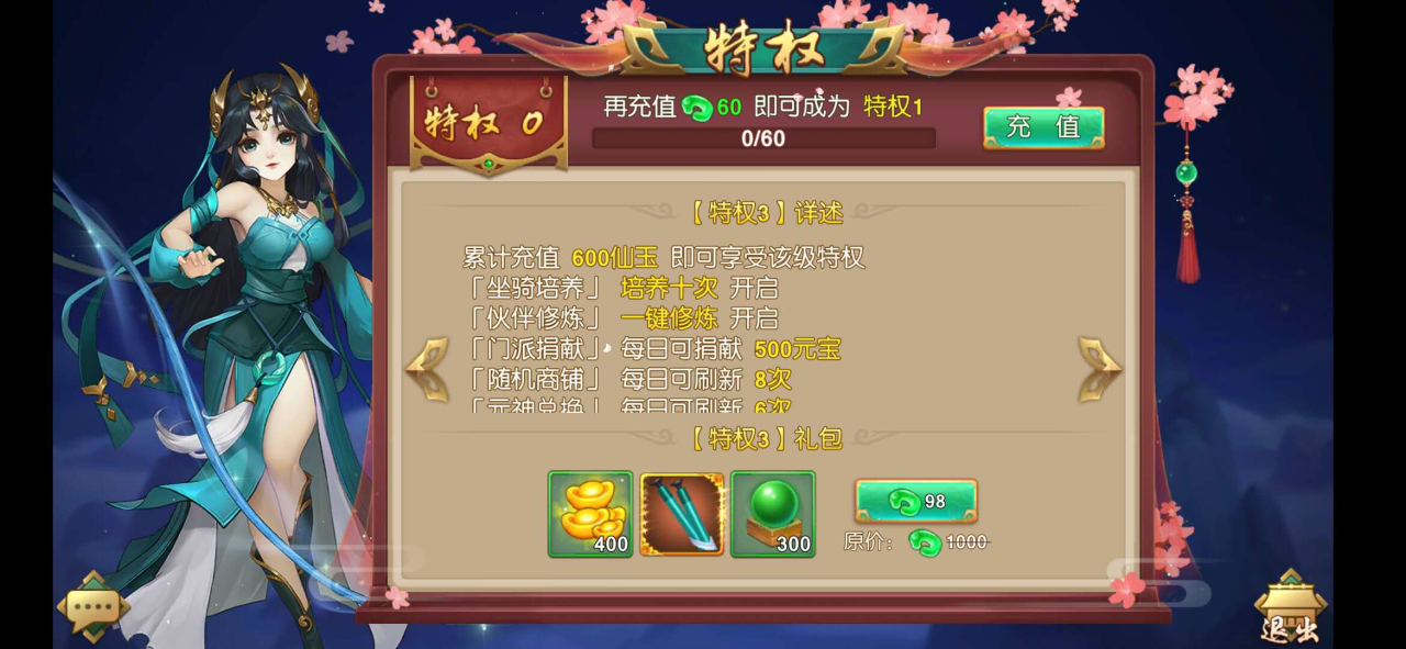特权等级越高可以购买的体力也就越多,自然等级提升也就快,充值一定数量的仙玉就可以激活特权,最高特权等级13级每天可以购买20次体力,自然升级也就飞快了。