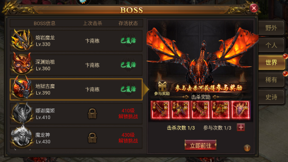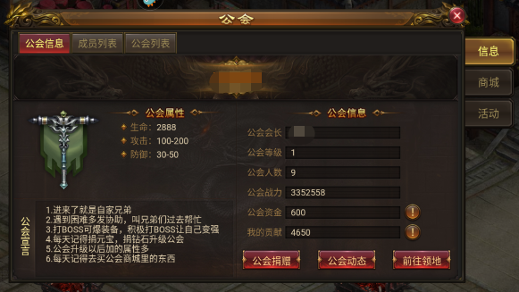 (2)公会归属:推荐大家加入一个大一些的公会,BOSSS奖励是按照公会来计算的,遇到难打的BOSS,可以召集公会的小伙伴来一起击杀,这样就能拿奖励的同时还能获得公会贡献。