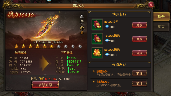 2、可以使用元宝来为斩杀进阶,以及使用星魂精华给星宫进阶。元宝可以通过分解装备和押镖任务获取,星魂精华可以通过每日任务得到。