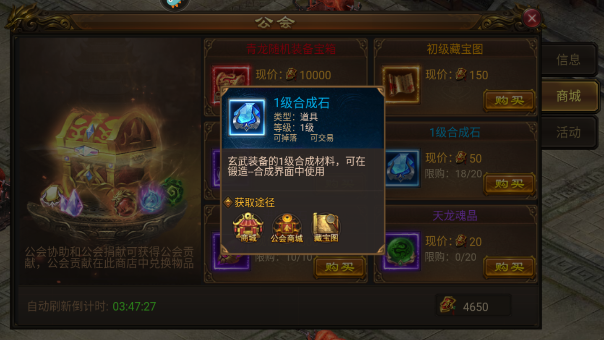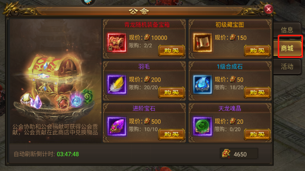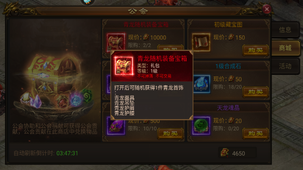 (2)初级藏宝图:藏宝图也一定要买光,目前可以先通过商城使用积分购买六个,剩下的四个用公会币购买。毕竟前期主要依靠藏宝图来凑齐玄武套装,一天十个宝图还是要保证的。