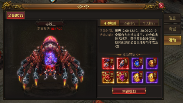(2)公会BOSS:击杀公会BOSS可以得到大量的公会币,公会的排名越高得到的越多,推荐大家加入强一些的公会。