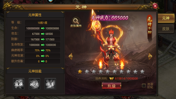 2、可以使用元宝来升级元神,元神的等级越高麻痹的几率就会越高。小编觉得只要麻痹几率在70%左右才能保证稳定输出,因此要注意元宝的获取。