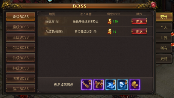 (3)其他BOSS:游戏中还有三种BOSS,分别是野外BOSS、稀有BOSS、史诗BOSS,这些BOSS大家根据自己的白虎符石等级走就行了,只要能破的了盾就能打得过。