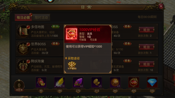 1、日常任务:完成日常任务可以得到活跃度,当活跃度达到405点的时候就可以领取1000点VIP经验值了。