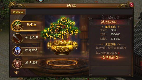 (1)聚宝盆:VIP1解锁聚宝盆。每5分钟,获得68888元宝,可以领取100次。