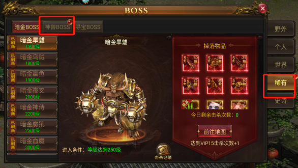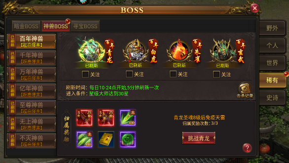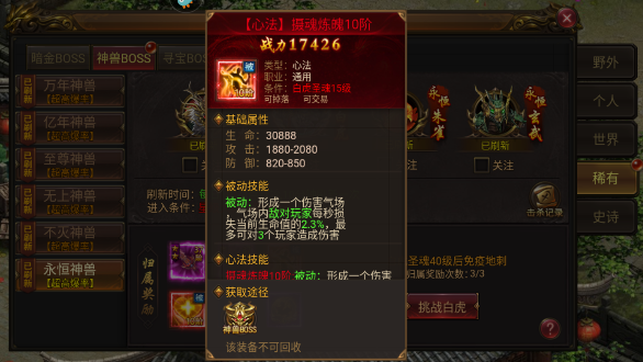 (1)神兽BOSS:神兽BOSS是专门获取心法的地方,每一种神兽和难度对应着一种心法秘籍。