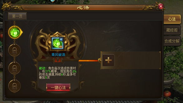 (3)分解合成:获得的没用的心法可以进行分解,相同的两个心法可以合称为一个更高级的心法,升级后心法的强度会得到加强。