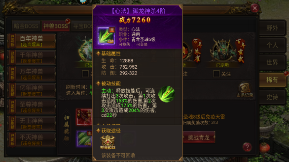 (2)活动获取:游戏初期可以通过活动和任务的方式得到少量的心法,不过主要还是要通过神兽BOSS来获取。