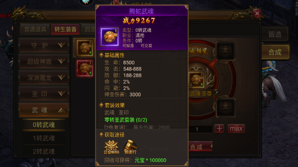 1、腾蛇武魂:可以通过击杀公会BOSS获取,或者在拍卖行拍卖获取,总的来说获取难度不算太高。