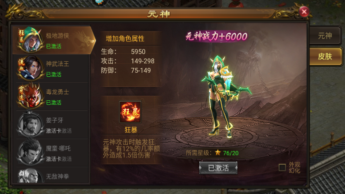 1、皮肤可以解锁元神的技能,以及带来攻击加成效果,后期皮肤也是少不了的。