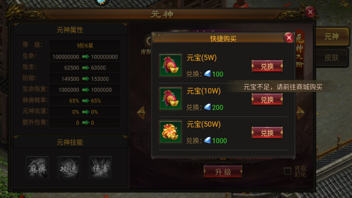 2、升级元神需要用到元宝,元神的进阶次数越高需要的元宝数量就会越多。