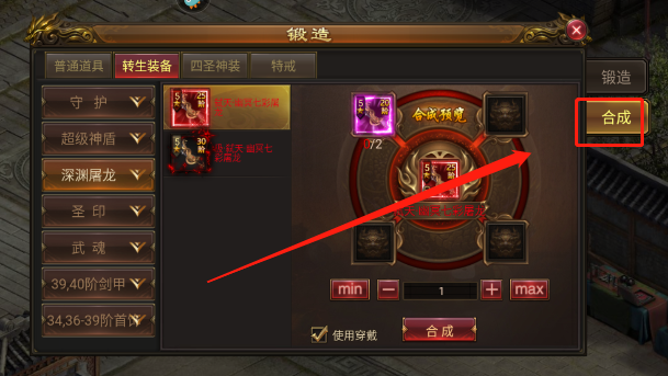 (5)锻造装备:也可以在锻造功能中使用“合成”功能合成稀有装备,这一类装备是可持续进行培养的,也是大家游戏后期重点培养对象。合成的装备要比同期装备属性更高,而且还能继续进行合成升级。