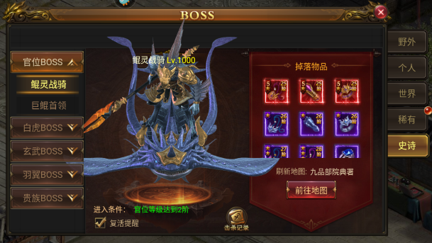 (4)史诗BOSS:对于普通玩家来说史诗BOSS是一定要打的,装备和元宝非常的多并且没有次数限制,最重要的是BOSS没有护盾大家慢慢磨血就可以了。