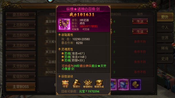 (1)野外BOSS:野外BOSS一共分为十五个级别,分别是妖级魔级、王级、帝级、仙级、神级、鸿蒙、盘古、上古、远古、太古、创世、灭世、星级、主宰。等级越高额BOSS难度越高,同时掉落的装备品质也会越高,这是玩家获取装备的主要途径。