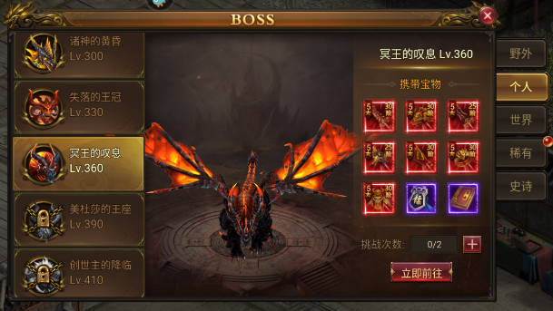 (2)个人和世界BOSS:个人BOSS是属于自己的,大家每天别忘了刷就行了,不过这个也是比较看运气的。世界BOSS可能会被其他玩家抢,不过掉落相对来说会更好一些,推荐在人少的服务器刷,这样被抢的几率低一些。