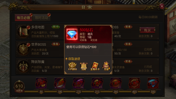 (2)每日任务:完成每日任务可以得到奖励以及活跃度,当天的活跃度达到550点可以领取到500个钻石,总的来说还是非常值得的。