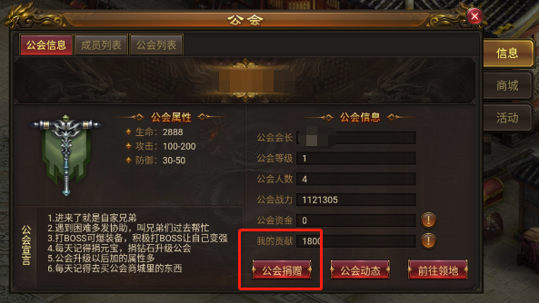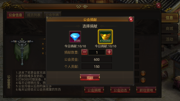 (2)公会资金:公会资金只能通过捐献来获取,可以使用钻石捐赠和元宝捐赠两个方法,每种方法每日最多只能捐赠十次。钻石捐赠每次消耗100钻石,增加1200点公会资金和300点个人贡献。元宝捐赠每次消耗10W元宝,增加600点公会资金和150点个人贡献。