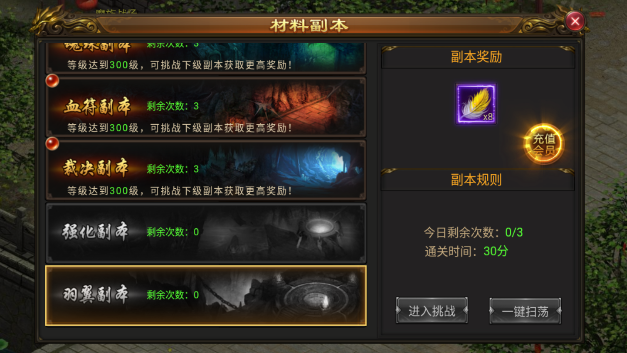2、材料副本:游戏中一共有六种材料副本,其中羽翼副本就是获取羽毛的地方,玩家等级越高获得的羽毛数量就会越多。如果开通VIP还能解锁扫荡功能。