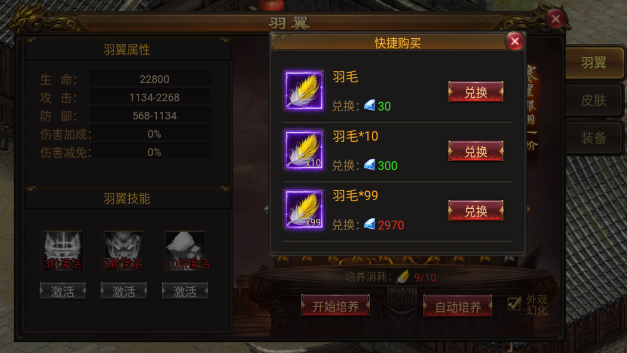 1、翅膀升级进阶需要用到羽毛,进阶的次数越多每次升级所需要的羽毛数量同时也会越多。