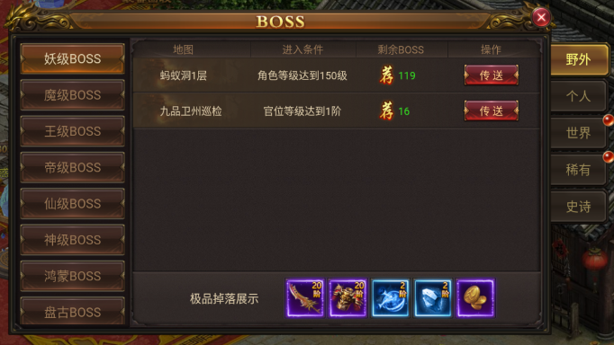 游戏中的BOSS一共分为五种,分别是野外BOSS、个人BOSS、世界BOSS、稀有BOSS、史诗BOSS。其中世界和个人BOSS是只有一只怪的,击杀或者是参与击杀都会有奖励。其他的里面会有小BOSS,在这里可以挂机刷元宝和装备。