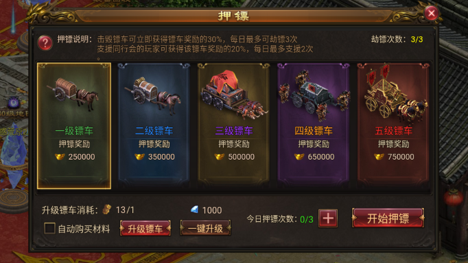 1、押镖是每日国定获取元宝的地方,押镖的等级越高获得的元宝数量就会越多。小编个人推荐大家押三级标,升级三级标的失败几率比较低,而且50W的元宝奖励相对来说性价比也是最高的。押镖每天最多只能三次,推荐大家在双倍押镖的时间再去押镖,这样一次就能有100W的元宝奖励。