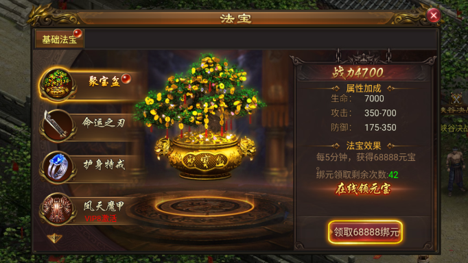 这个是提升VIP解锁的功能,VIP等级是白嫖来的,不过这个等级作用也不算太大。解锁聚宝盆之后每过五分钟可以领取6W多的元宝,不过领取上限是100次。