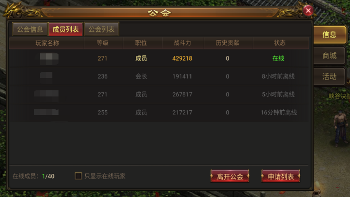 1、如果是公会会长,那么依然是先进入到公会系统的“成员列表”,然后点击右下角位置的“申请列表”,此时就能显示出已经申请的玩家了。