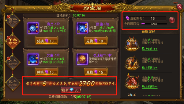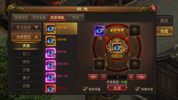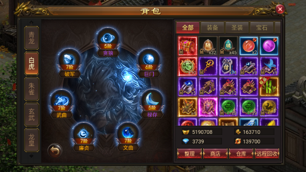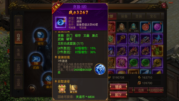 2、游戏中卡六阶白虎是很难受的,大家每天最好把兑换用的石头刷满,大家在第五天到第六条的时候就能凑齐一套六阶的了。