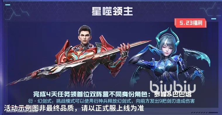 首先就是新武器的G3A3-衍神兵的登场,该武器可在”衍神兵·械能觉醒兑换商城”进行兑换,同时还能兑换其他全新的万化道具。还可参与星噬领主活动,完成4天任务,就能免费获取”罗峰&巴巴塔”,这都是吞噬当中经典的角色,本次成为游戏中双阵营不同身份的角色,挑战模式里面还有专属技能,一定要拿下。