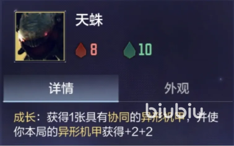 这个阵容角色牌一共有5张,分别是天蛛,孙悟空,机关蛇,凤凰,N22,天蛛具有成长技能,获得1张协同的异形机甲牌,并使用本局的异形机甲拿到+2+2。其他角色就不在这详细解析。