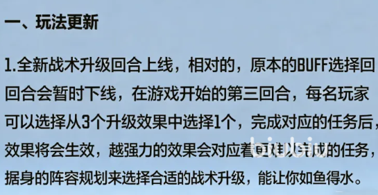 简单来讲,它是本赛季替代了传统buff选择回合的一个新机制,在开局第3回合系统将提供3个不同升级效果选项,和以往直接生效的buff不同,这些升级的效果需要大家去完成对应的任务才可以激活,选择的效果越是强,也就对应着难度更高的任务,意味不再是简单去选择一个buff,而是对阵营的规划、局势判断的综合考验,大家需要同时去根据阵营情况,以及对任务完成判断,去拿最为适合自己的效果。
