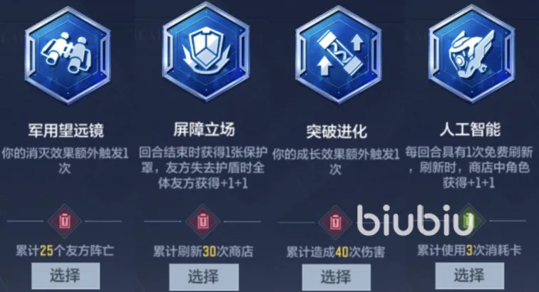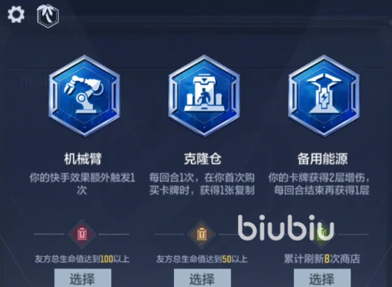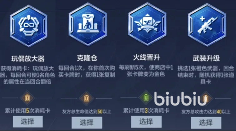 选择比较简单且通用的,比方说每回合1次,在购买卡牌时获得1张复制的“克隆仓”、每刷新5次,就使得商店中1张卡牌变成金色的“火线晋升”、挑选1张橙色武器,回合结束时随机获得1张道具卡的“武装升级”、每回合能使得一名角色的属性在当回合翻倍的“玩偶放大器”等,这些条件都不难很适合去选,最后还需要注意,选择择升级效果是有时间限制的,如果超过了时间还没有做出抉择,那么系统将会自动帮助大家去选择一个,这个选择很有可能会对我们没太大作用,所以大家一定要看好时间,避免时间出现了超过的情况。