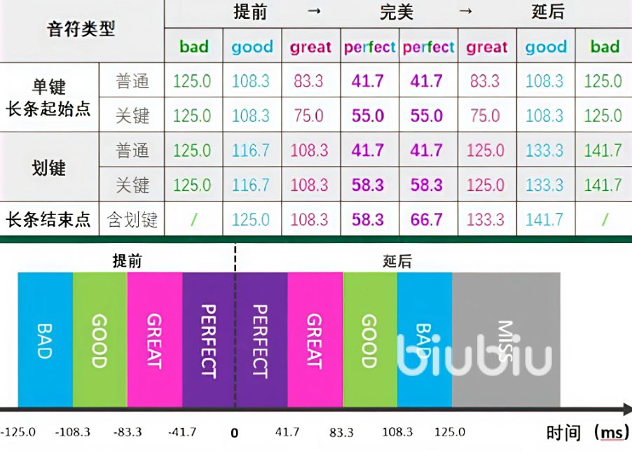 如图所示,这是具体的音符判定范围或者说区间,看着有点密密麻麻,其实大家只要记住2点,1个事黄键的“完美perfect”判定区间是要比普通按键久的。