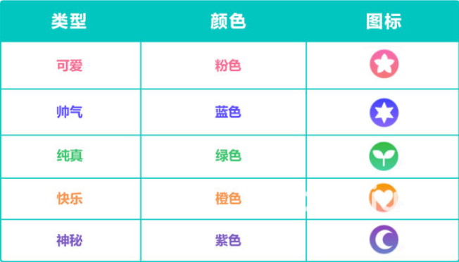 每一名成员都被赋予了5种类型的其中一种,类型图标在成员完整图的右上角或缩略图的左上角可以显示。具体对应的颜色与类型如下,“可爱”对应着粉色,“帅气”对应蓝色,”纯真”对应绿色,“快乐”对应着橙色,“神秘”对应紫色,这五种类型还有各自的图标,大家也可以参考上图。