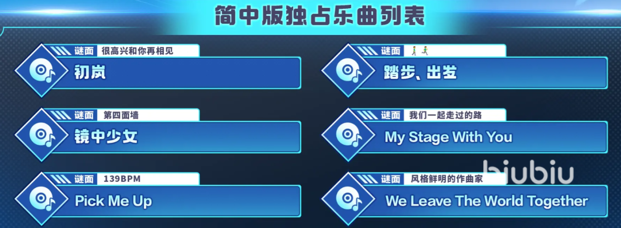 第二个活动则是在本次的公测之后将会推出独占歌曲,本次的独占歌曲是国服版本才有的,玩家们在其他服是看不到的。这里面的曲目包括初岚,镜中少女,踏步、触发,梦色星球等等。除此以外在之后还有着其他的独占曲目介绍。