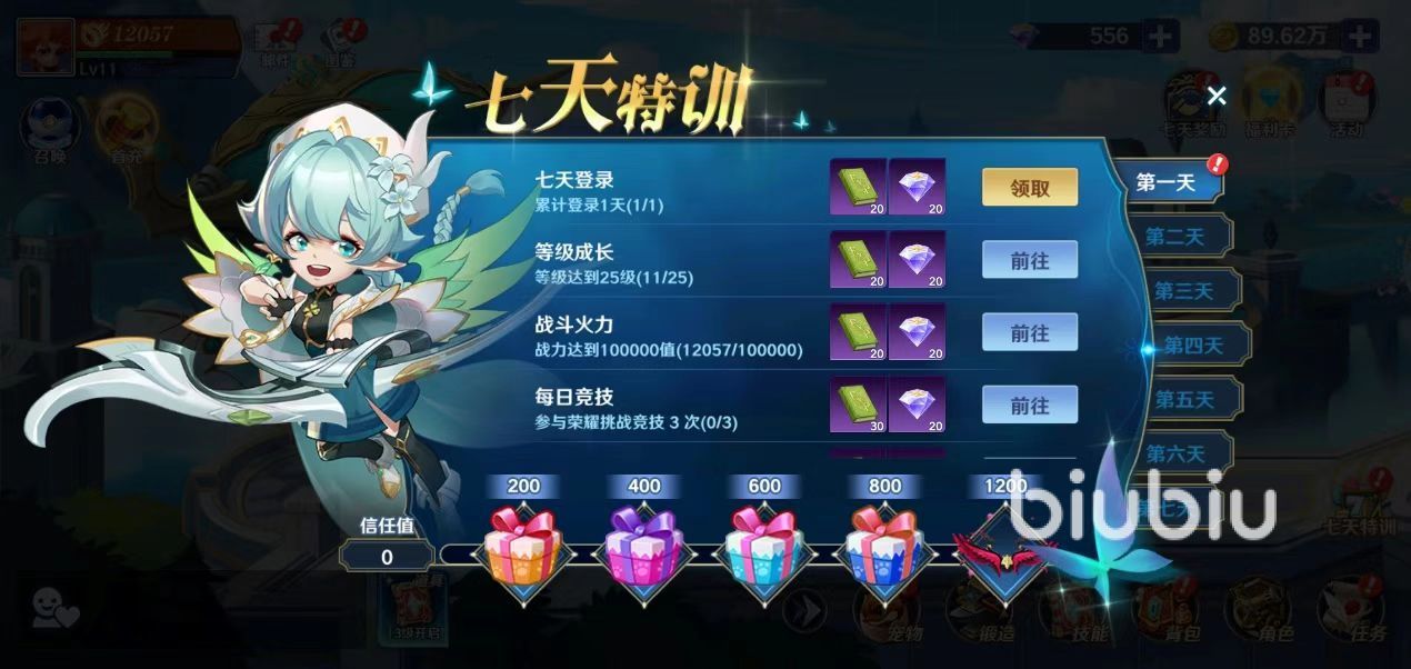 然后就是七天训练任务了,每日完成一定的任务就能获得经验、钻石等福利奖励,达到一定数值还可以解锁相应的礼包奖励,这一游戏任务同样也是对于刚接触弹弹奇妙冒险该游戏的玩家不可或缺的一大折扣了。