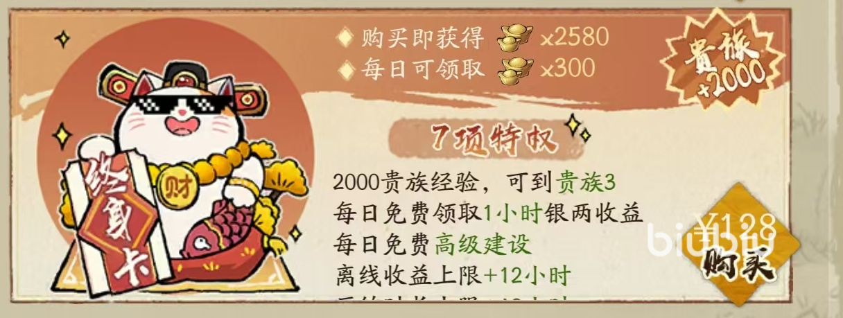 2、终身特权卡:128元,购买立刻获得【元宝】x2580,30天每天可以领取【元宝】x300,同时解锁诸多特权,且永久可用。中氪玩家必买,同样是早买早享受。