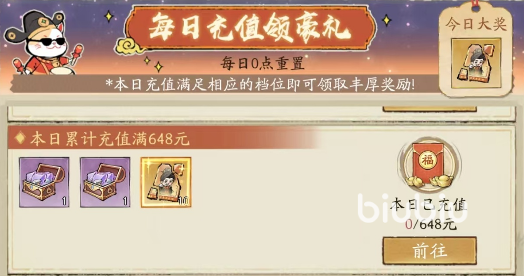 1、累计充值:当日累计充值档位分为别6元、30元、98元、198元、328元、648元、1000元。累计充值将获得【升星芯片碎片】,用以为门客升星,除6元档位外,其余档位还将获得特殊门客道具,用以合成特殊门客,或门客时装。建议玩家在一个月的某几天集中充值,以获得最大收益。