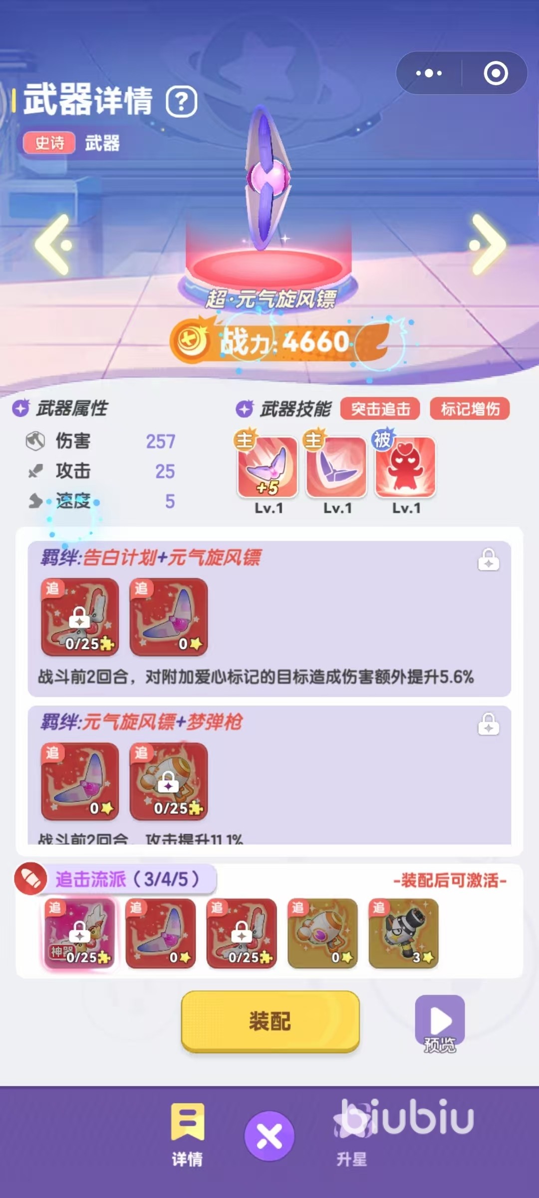追击流派的核心武器推荐使用元气旋风镖、梦弹枪和告白计划这三把。元气旋风镖作为起手武器非常稳定,发射6颗子弹,每颗命中都能附加1层爱心标记,持续3回合。这些标记是后续触发额外追击伤害的关键,可以说是整套体系的基础铺垫手段。在实战中,元气旋风镖的命中率较高,加上自带2000追击值,在对战前期能迅速为敌人挂上足够标记,为下一阶段的输出打好节奏。