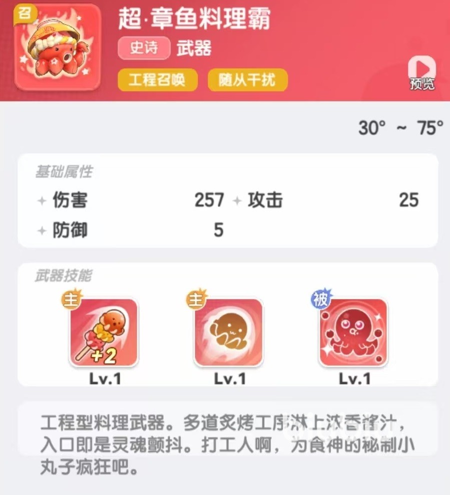 机械精灵球能够召唤出喵喵无人机,无人机无法被攻击,每次射击都会叠加伤害,自身每次受到攻击,都有几率直接召唤出无人机发起一次攻击。章鱼料理霸使用时能够大幅度增加集火属性,子弹未直接命中目标时可以分裂成两个爬行章鱼。造成伤害后,随后在目标周围召唤出料理章鱼。被动技能可以在每个召唤物离场时,自身都能获得2%的伤害加成,叠加起来伤害可观。臭臭垃圾桶在使用时可以召唤出小偷鸡,小偷鸡每次攻击时会偷取对方的攻击,最多能叠加4层。