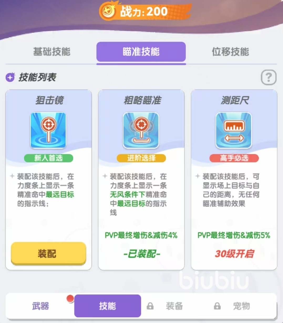游戏系统中的技能分为三类,分别是基础技能,瞄准技能和位移技能,其中瞄准技能和位移技能都只能携带一个,小编优先来进行介绍。瞄准技能主要有三个,分别是狙击镜、粗略瞄准和测距尺。狙击镜是属于新人首选。装备之后在力度条上。会显示一条精准命中最远目标的指示线,跟着指示线去施法就可以了,非常方便。粗略瞄准属于进阶类型的技能,装备之后在力度条上会显示一条无风条件下精准命中最远目标的指示线。