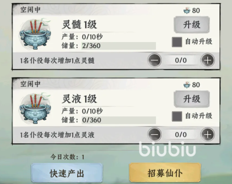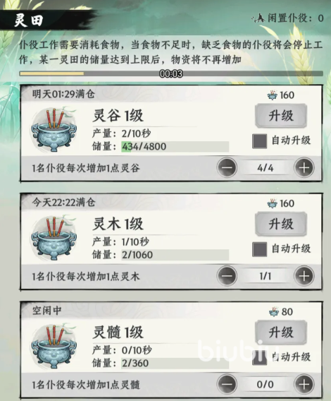 灵田的核心产出靠四种建筑材料撑着,它们分别是灵谷、灵木、灵髓、灵液,道友们可以去招募仙仆,把他们分配到四种材料的产出岗位上,每位仙仆能给对应材料增加 1 点增长值,资源产出是10秒一个周期。