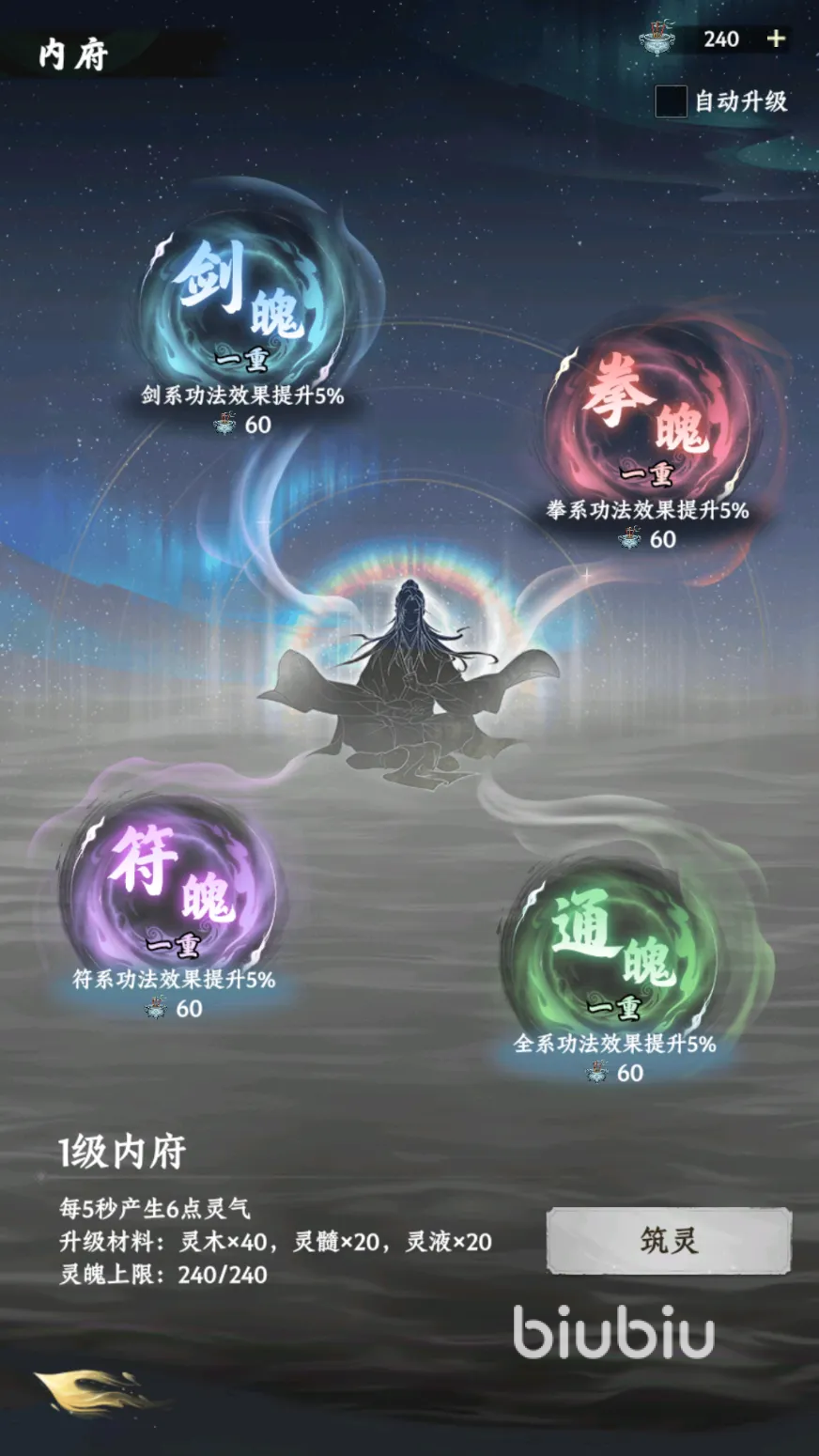 要是只想着其他三种资源,不给灵谷分配,时间长了所有仙仆都会罢工,除了负责消耗的灵谷,其他三种资源的用处要搭配内府来用,点击内府能看到这里面有四种核心升级属性,分别是剑魄、拳魄、符魄、通魄。