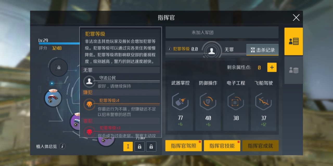 由于犯罪等级高于3级后会进入红名状态,因此玩家需要时刻注意自己的角色面板,一旦进入红名状态立刻跃迁回基地。这是因为红名会被星系警察和其他玩家也可合法攻击,此时就需要通过完成星系任务、星系悬赏来缓慢降低犯罪等级。