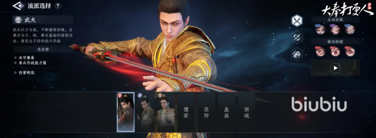 武夫攻守兼备,单兵作战能力强,适合喜欢近身战斗,享受拳拳到肉攻击方式的玩家,他能选择修炼的内功有3种,第1种“天圣修骨法”能每秒回复0.75%生命值,并且在遭受致命伤害之际,能让本次的伤害直接无效,适合想要堆血量抗伤的,第2种“碧血淬神功”同样有免除一次死亡的效果,并且当自身的气血越低,带来的受伤减免和伤害加成就越高,适合半肉或输出路线,第3种“大乘种玉法”能在每次使用技能后,获得130%攻击的护盾,护盾存在能得到10%伤害加成,破碎会回复119%的生命值,这种通过和攻击挂钩的护盾来保证自己生存的,是纯输出的首选;
