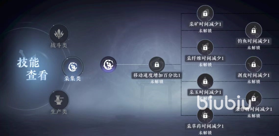 采集类也是如此,但主要增加的是和采集相关的技能,例如移动速度增加,采矿时间减少,采纤维时间减少,采玉时间减少等。学习了这些采集类技能,就可以在更短时间内获得资源。最后是生产类,生产指的是将采集获取到的资源,加工成装备或道具。主要增加的是背包负重值,武器制造时间减少,防具制造时间减少,首饰制造时间减少等。