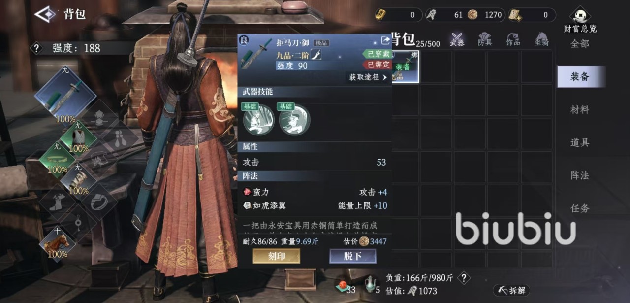 目前游戏中的武器一共分为不同的品级,从九品一直开放到五品,每个品级中还有不同的颜色差异。在种类方面,目前开放的主要包括刀、剑、枪、扇子、拳套、法器这六种。不同类型的武器获得的方式都是一样的,主要获得的。途径有以下几类,分别是探索副本、探索宝箱和副职业打造。